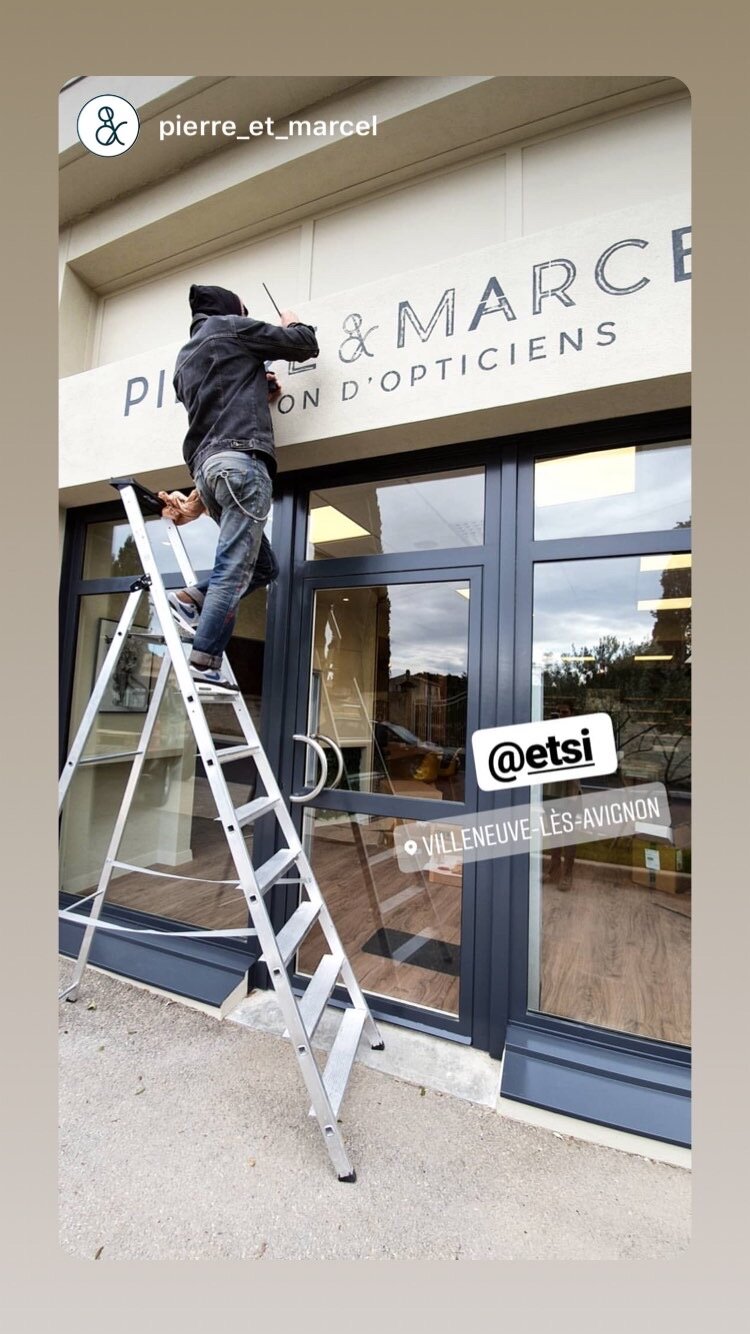 Peinture devanture faite à la main : résultat qualitatif et authentique. Les cartes de visites suivent, sur un papier vergé tradition.